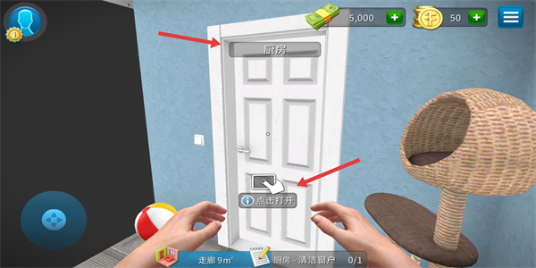 2、根據任務指引,找到目標房間的門,點擊打開進入房間,準備開展房間內的家居修繕或清潔工作。