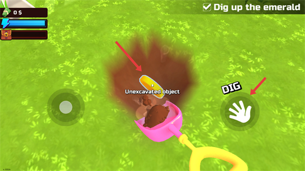 2、點(diǎn)擊DIG按鈕挖掘發(fā)現(xiàn)未挖掘的物品后持續(xù)挖掘,獲取寶藏積累財(cái)富和資源。