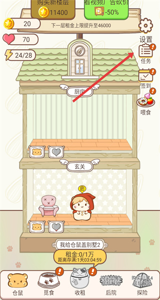 4、完成覓食后獲取金幣等資源,積累這些資源可用于購買新樓層升級倉鼠別墅,逐步擴大別墅規(guī)模,提升倉鼠的居住與活動空間。