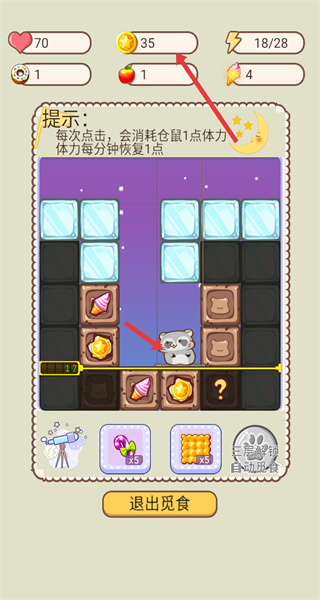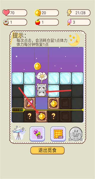 3、根據(jù)任務(wù)要求,消耗體力進行覓食,操控倉鼠在格子中移動,收集金幣食物等資源,同時注意體力消耗與恢復。