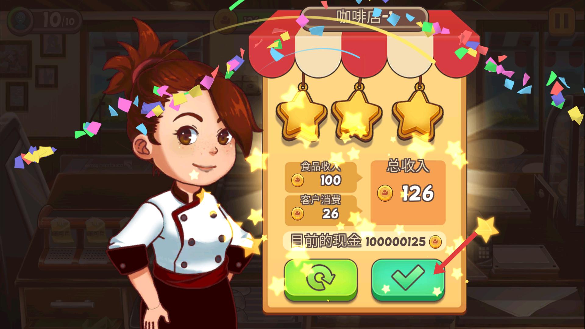 4、完成店鋪經(jīng)營后,若獲得三星評價,點(diǎn)擊綠色對勾按鈕,確認(rèn)本次經(jīng)營成果,繼續(xù)游戲進(jìn)程。