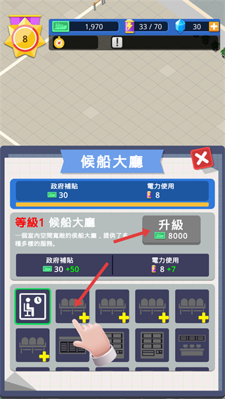 4、在候船大廳界面升級(jí)設(shè)施并添加座椅,提升候船大廳的服務(wù)能力和等級(jí)獲取更多補(bǔ)貼和資源。