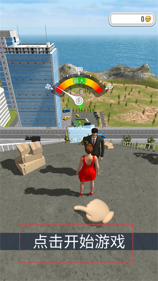 1、玩家調整彈射力量將角色從高處彈射出去,控制彈射角度和力度,然后點擊圖標標記的開始游戲。