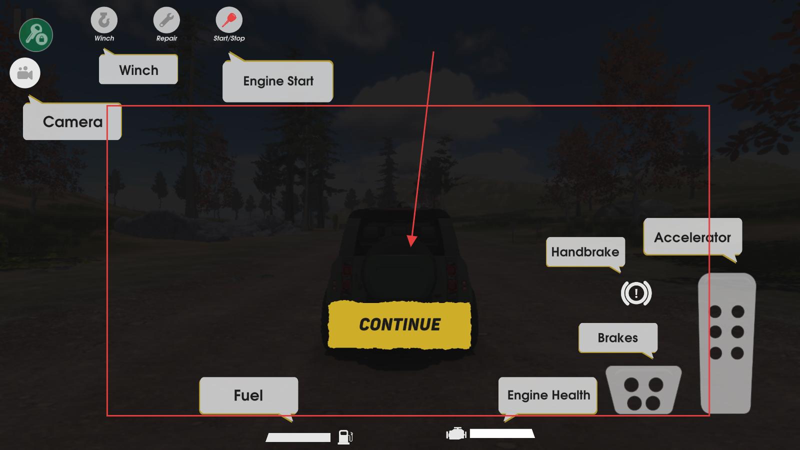 1、進(jìn)入后點(diǎn)擊CONTINUE開(kāi)始游戲,熟悉車輛的各項(xiàng)功能按鈕,如絞盤、維修、啟動(dòng)/停止等,為駕駛做好準(zhǔn)備。