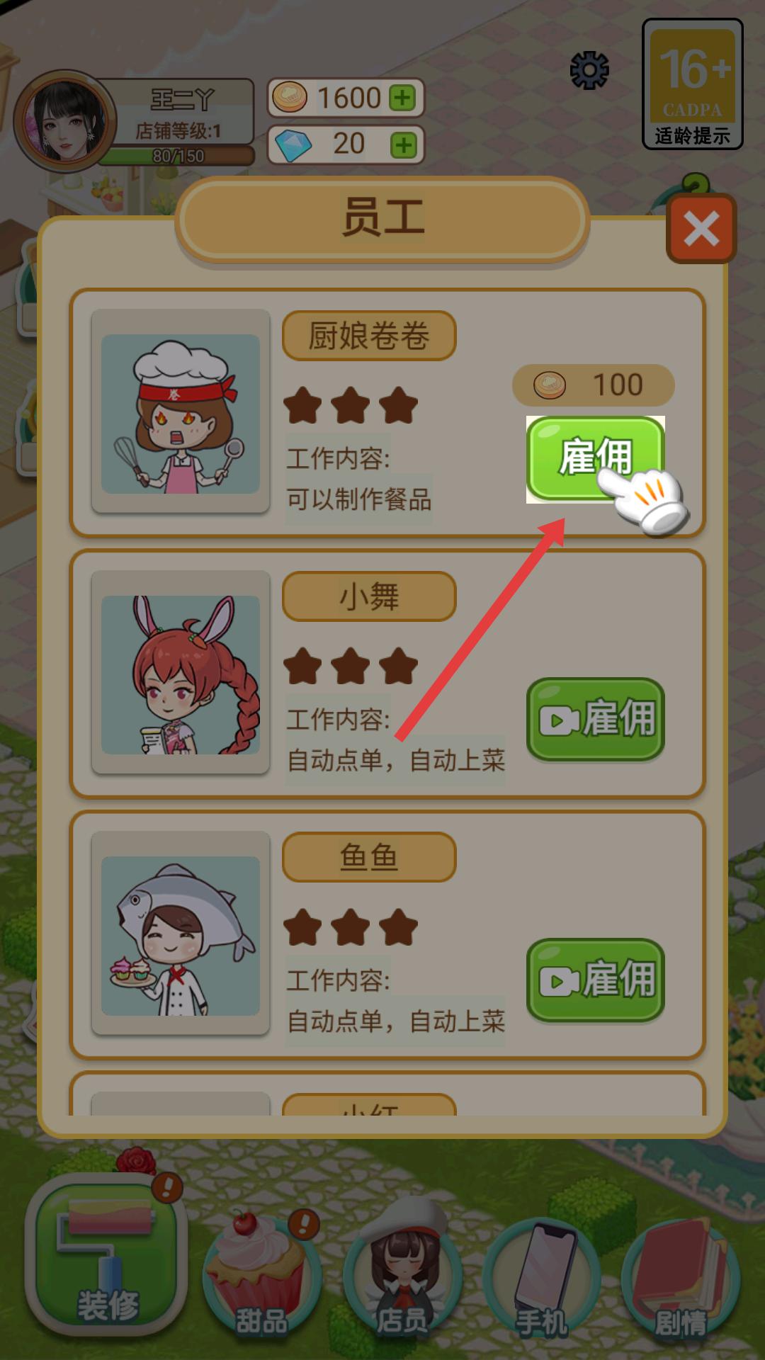 4、在員工界面,可雇傭廚娘卷卷,花費100金幣雇傭后,她能幫助制作餐品,提升店鋪運營效率。