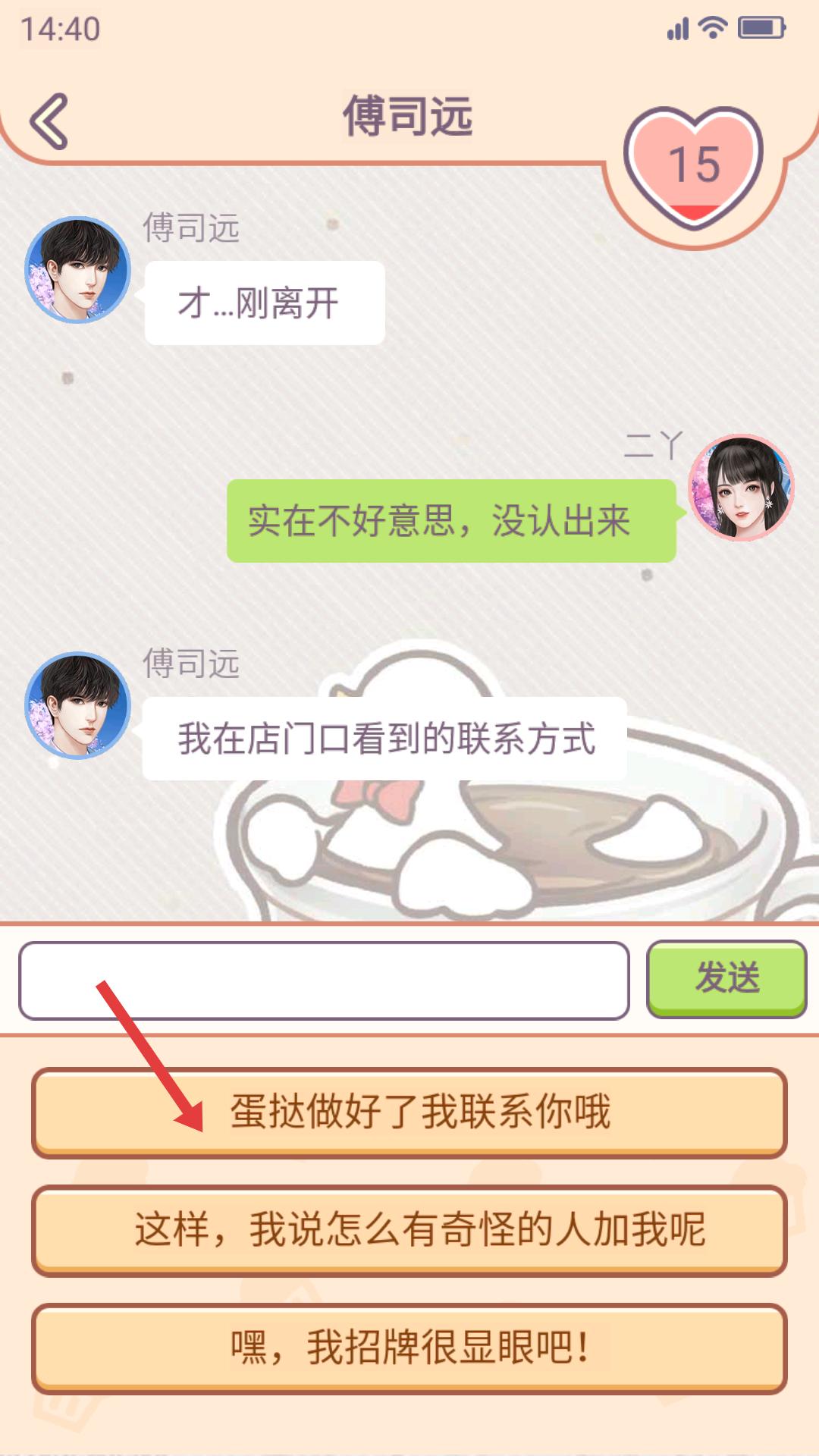 2、當傅司遠提及聯(lián)系方式來源時,選擇蛋撻做好了我聯(lián)系你哦選項,能繼續(xù)發(fā)展劇情,增加好感。