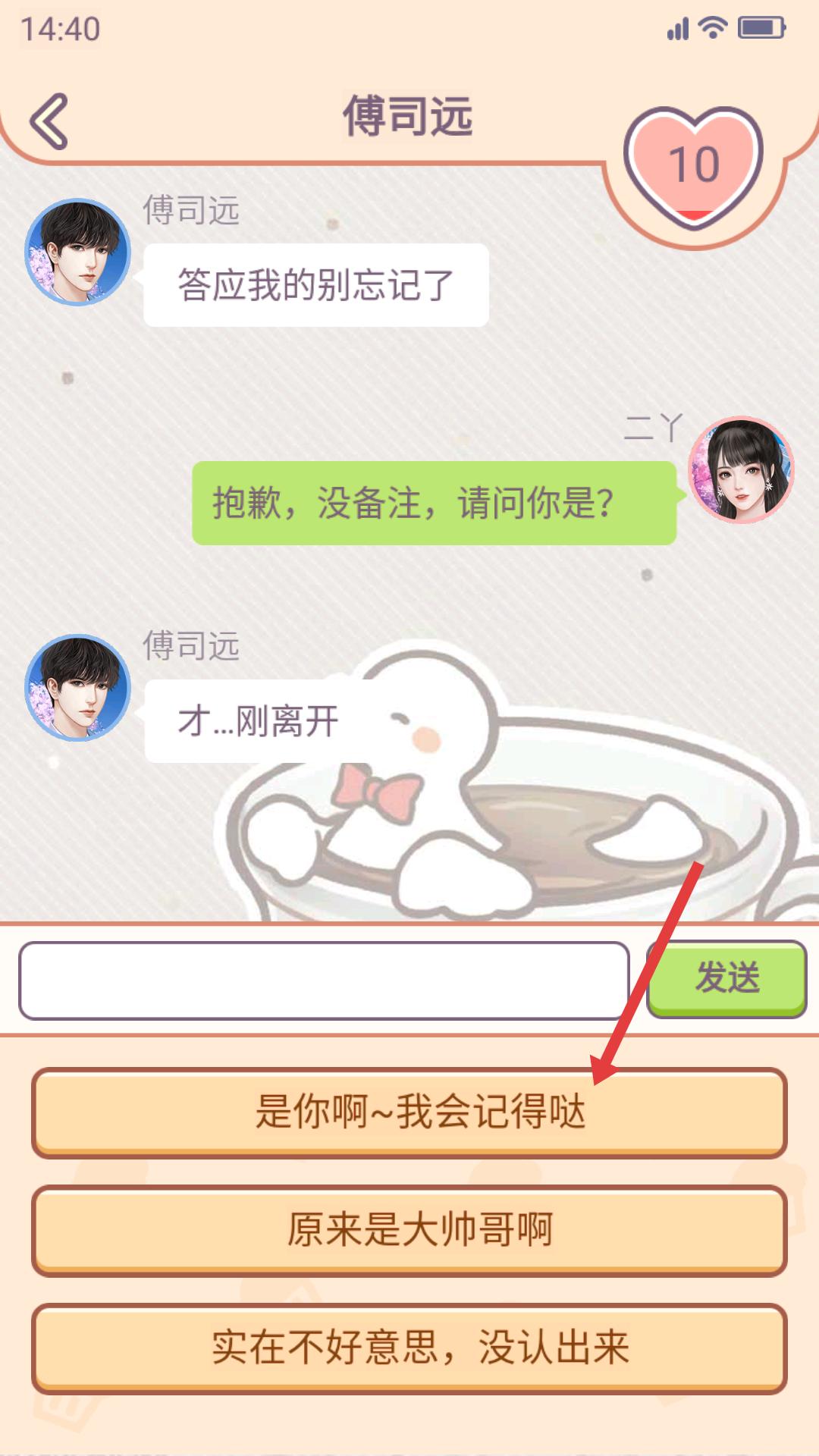 1、與傅司遠聊天時,選擇是你啊我會記得噠選項,可推進對話,提升好感度。