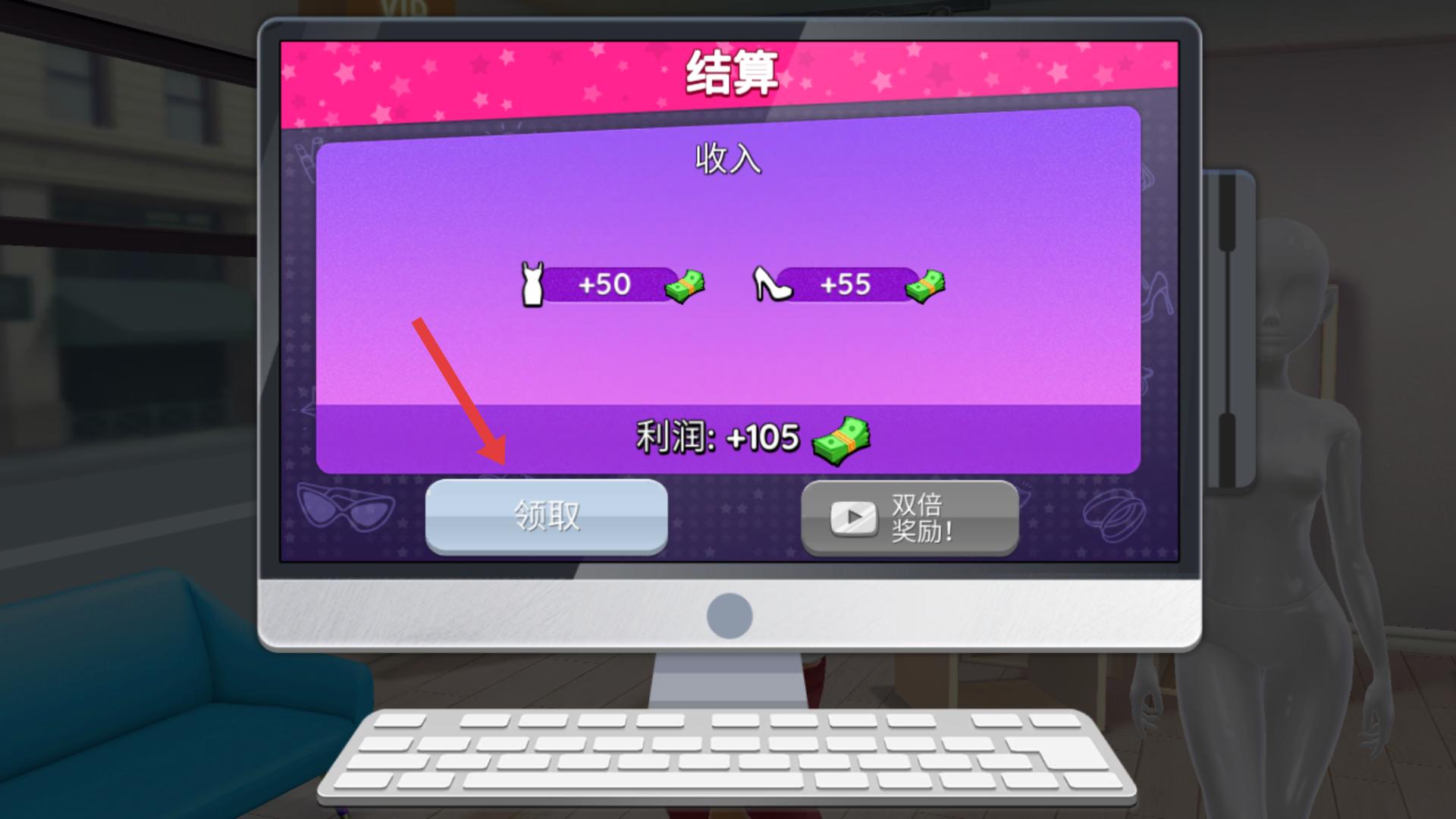 4、完成客戶搭配任務(wù)后,會進(jìn)入結(jié)算界面,點(diǎn)擊領(lǐng)取按鈕,可獲得本次任務(wù)的利潤獎勵,積累資金用于后續(xù)的時尚設(shè)計(jì)。