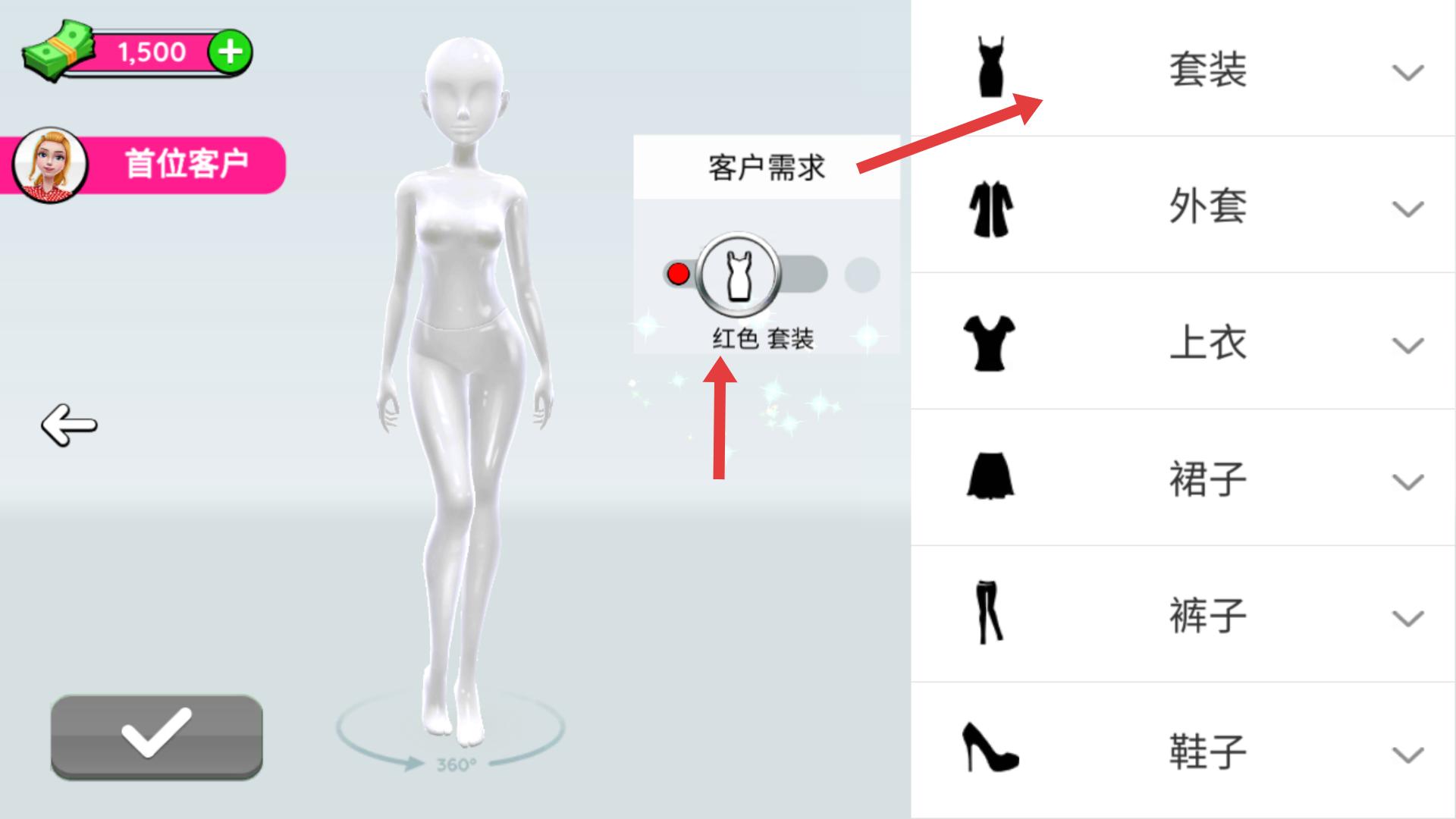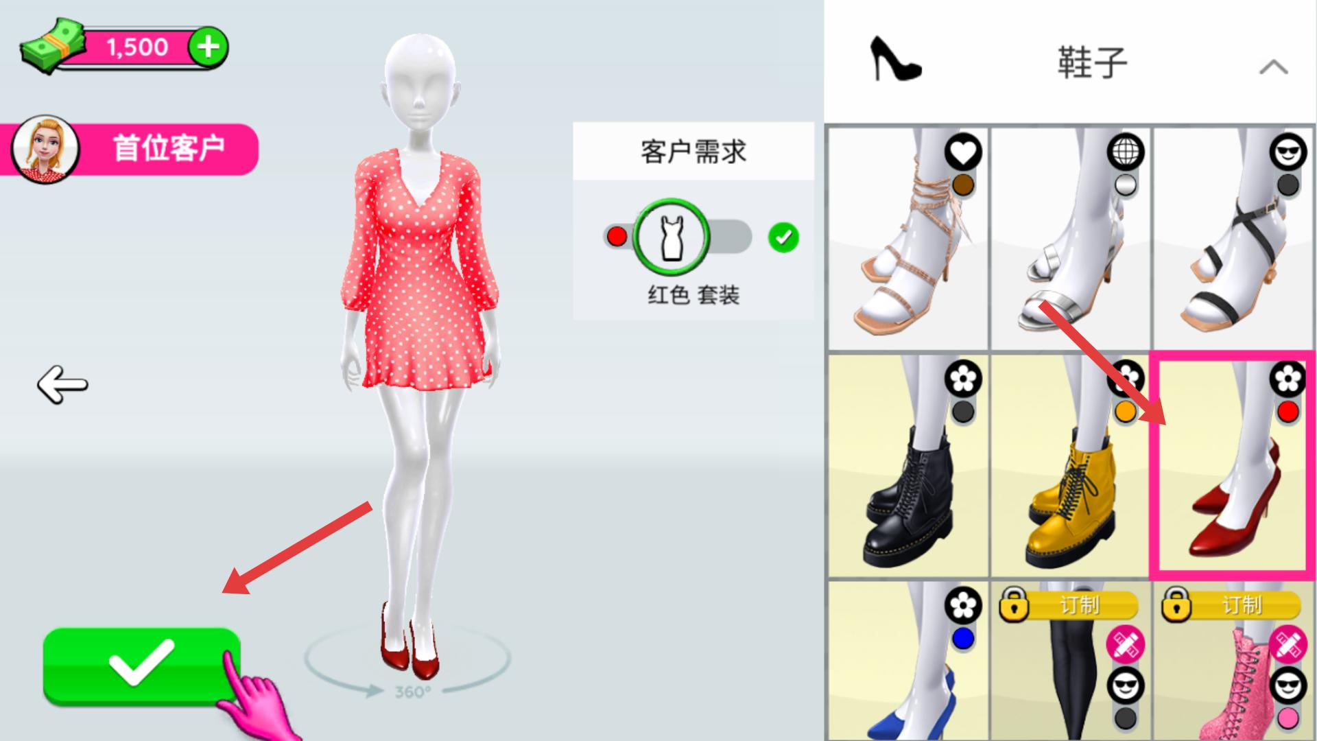 3、搭配好服裝后,還需選擇合適的鞋子,如紅色高跟鞋,搭配完成后點(diǎn)擊左下角綠色對勾按鈕,確認(rèn)搭配方案。