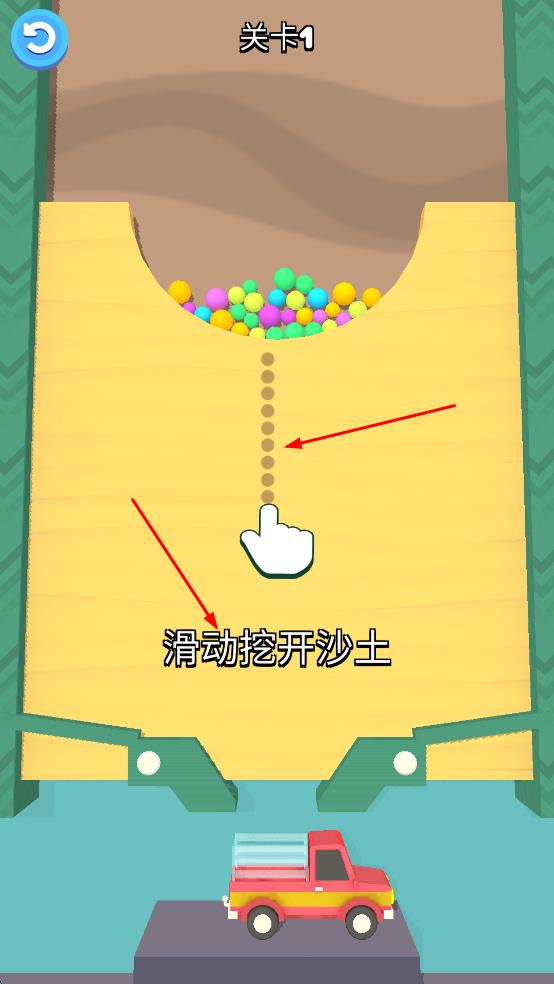 1、打開游戲進(jìn)入對應(yīng)關(guān)卡內(nèi),按提示滑動(dòng)挖開沙土通道,讓上方彩球滾落,注意通道需對準(zhǔn)下方卡車,確保彩球順利收集。