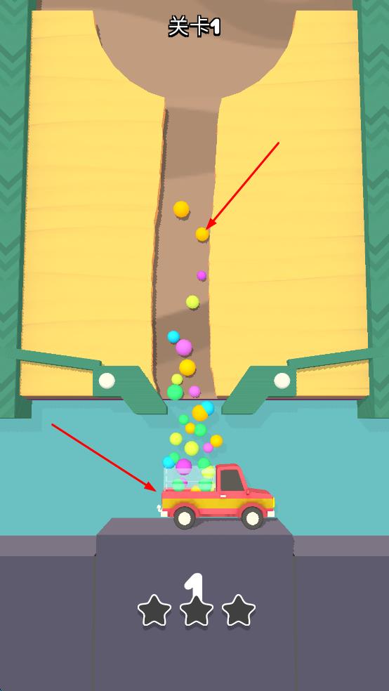 3、挖通小球通道后,可以引導(dǎo)彩球落入卡車,盡量讓更多的彩球收集,裝滿后即可完成關(guān)卡,獲取星星評價(jià)。