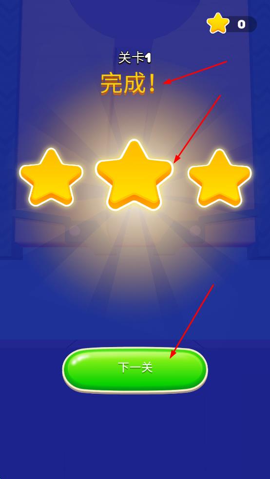 4、完成游戲的關(guān)卡后,可以查看完成提示與星星評價(jià),點(diǎn)下一關(guān)繼續(xù)挑戰(zhàn),積累星星可解鎖更多內(nèi)容。