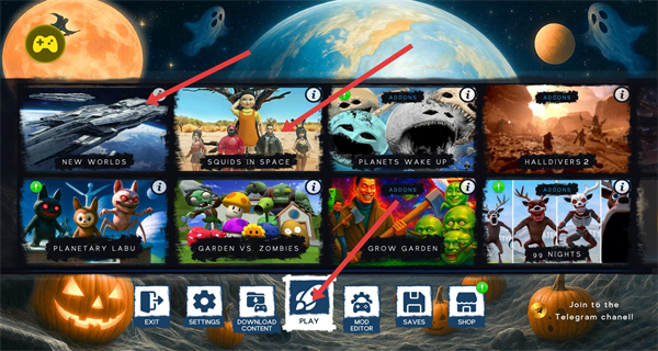 1、進入游戲主界面先選想玩的關卡像NEW WORLDS等,選好后點擊下方PLAY按鈕即可加載進入對應關卡開始冒險。