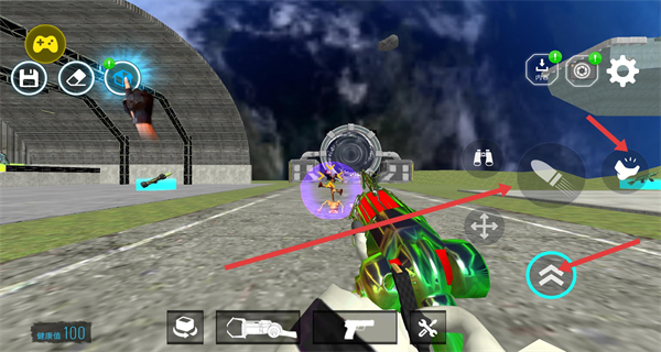 2、在游戲戰(zhàn)斗界面熟悉右側功能鍵,按需點擊導彈圖標用遠程攻擊,點雙層箭頭可切換武器形態(tài),配合操作對抗敵人完成任務。