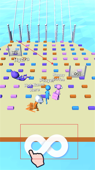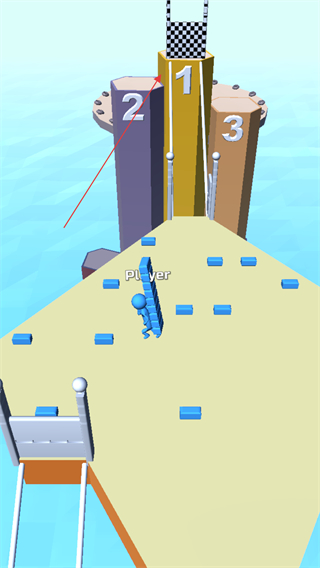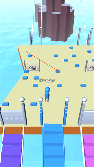 2、操控角色在賽道上移動(dòng)躲避障礙物,與其他玩家競速爭取率先到達(dá)終點(diǎn),同時(shí)收集賽道上的倍數(shù)獎(jiǎng)勵(lì),提升磚塊收集效率。