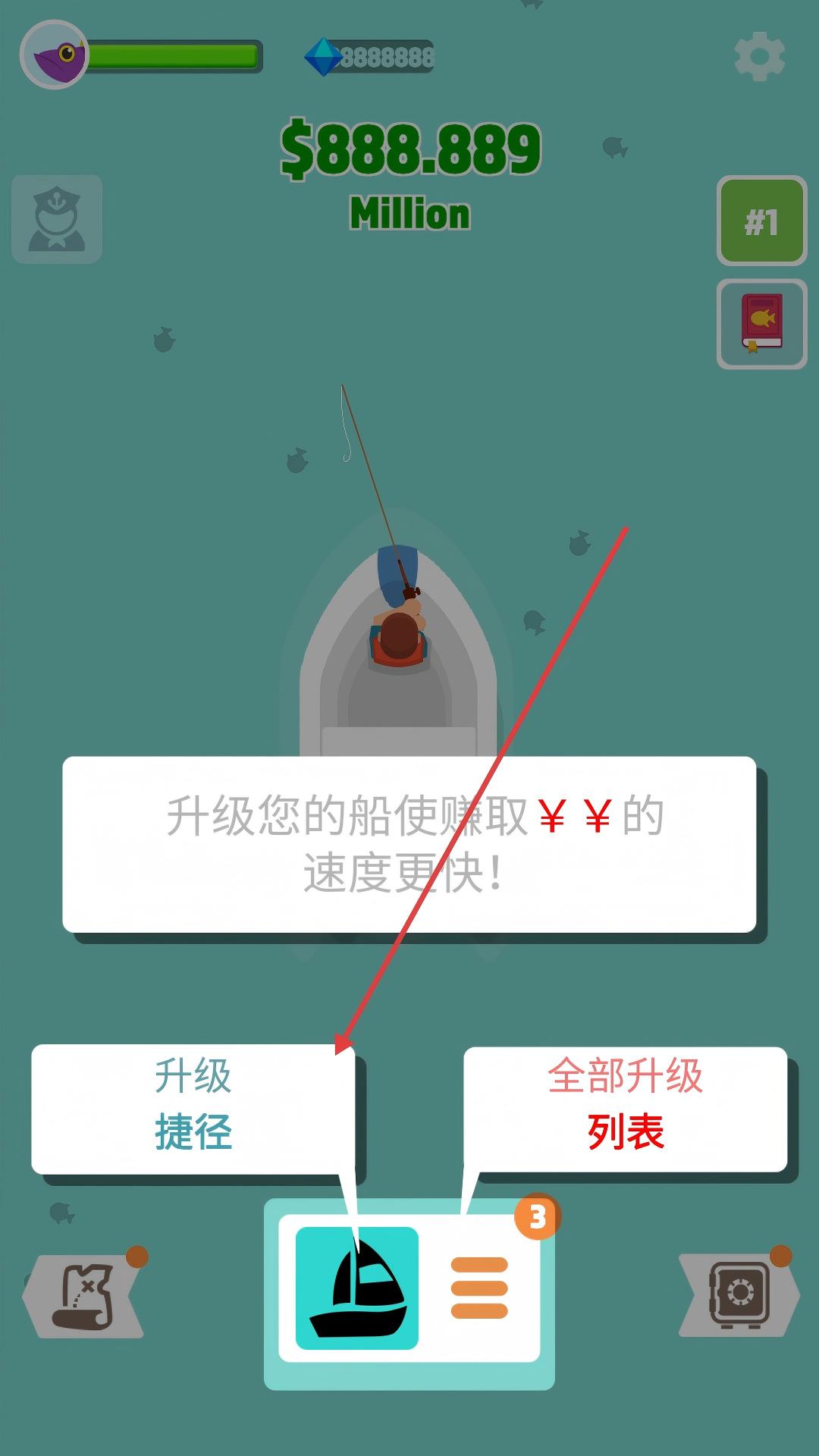 2、點擊升級捷徑,可快速提升船只賺錢速度,升級船只能增加撈魚效率和收益,是游戲進程的關(guān)鍵,應(yīng)及時進行船只升級操作。