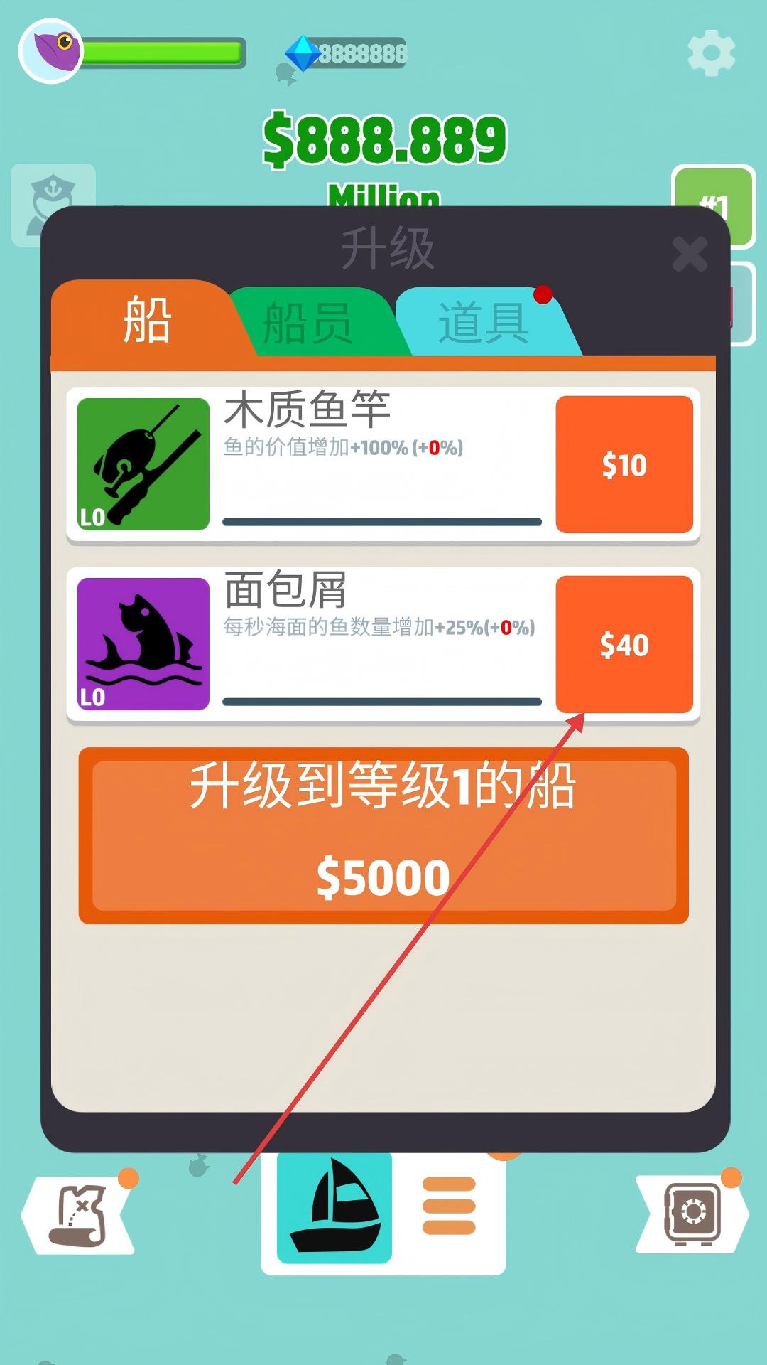 3、在升級界面購買面包屑等道具,面包屑可增加每秒海面魚數(shù)量,提升撈魚收益,需根據(jù)資金情況優(yōu)先購買提升收益的道具。