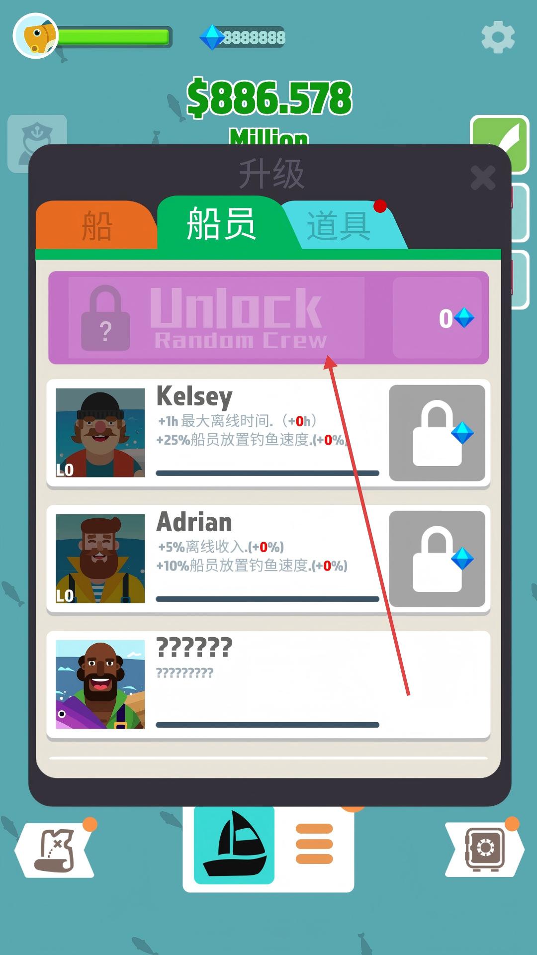 4、解鎖船員可提升釣魚速度和離線收入,不同船員有不同加成效果,需積累資源解鎖船員,增強撈魚和賺錢能力,推進游戲發(fā)展。