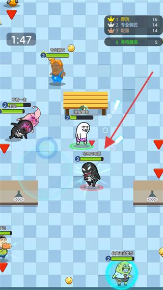 3、找到可攻擊的對手后,操控角色向其發(fā)起攻擊,通過技能或道具降低對手的生命值,提升自己的排名。