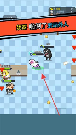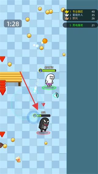 2、在對戰(zhàn)場景中操控角色移動,收集金幣和道具,同時注意躲避其他玩家的攻擊,觀察其他玩家的位置,制定對戰(zhàn)策略。