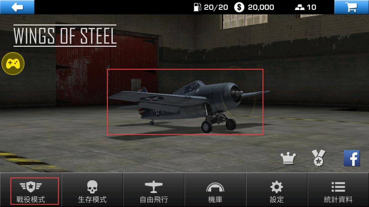 1、進(jìn)入游戲可看到戰(zhàn)機(jī)停在機(jī)庫(kù),下方有戰(zhàn)役模式、生存模式、自由飛行等選項(xiàng),選擇后可開(kāi)啟相應(yīng)的空中戰(zhàn)爭(zhēng)體驗(yàn)。