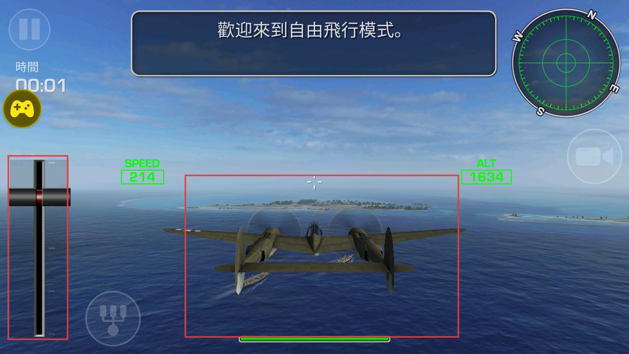 3、進(jìn)入自由飛行模式,可駕駛戰(zhàn)機(jī)在海上、島嶼上空飛行,界面顯示速度、高度等數(shù)據(jù),享受自由駕駛的樂(lè)趣。