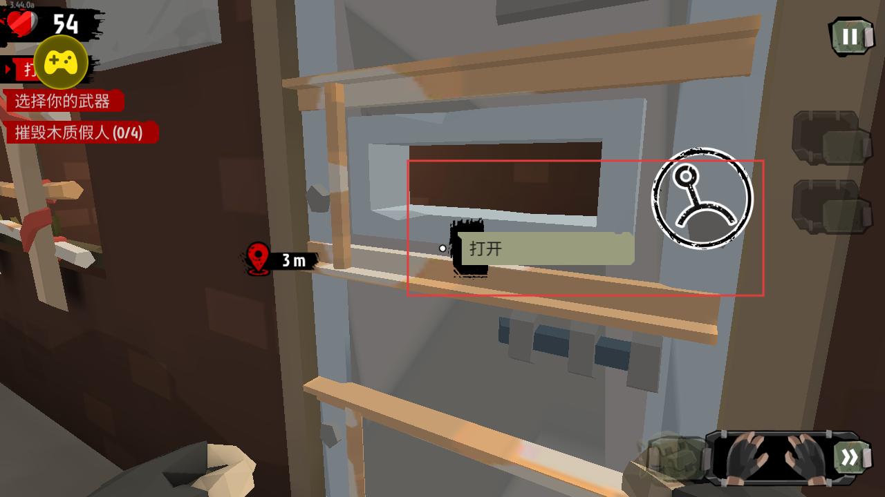 3、在場(chǎng)景中遇到可互動(dòng)的門,點(diǎn)擊打開按鈕進(jìn)入,探索內(nèi)部區(qū)域,完成摧毀木質(zhì)假人等任務(wù)。