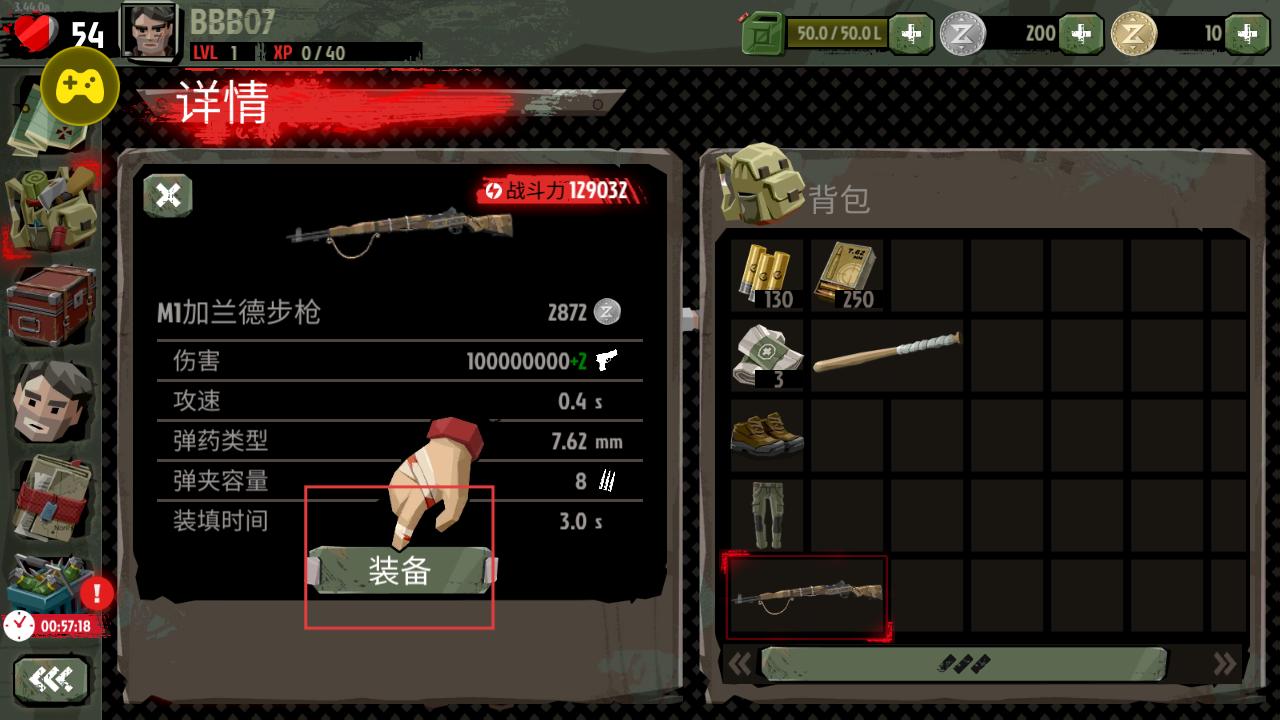 4、在詳情界面可查看M1加蘭德步槍等武器屬性,點(diǎn)擊裝備按鈕,提升戰(zhàn)斗力以應(yīng)對(duì)僵尸威脅。