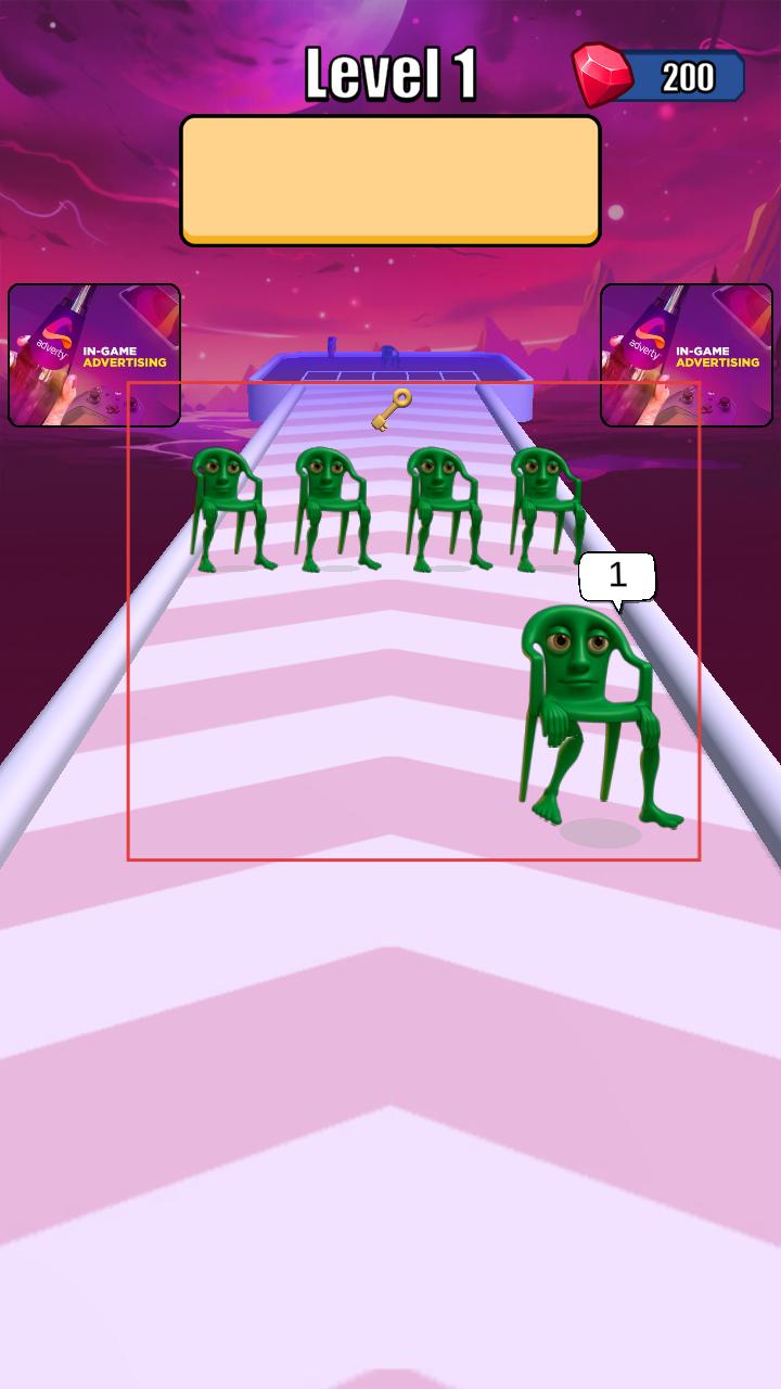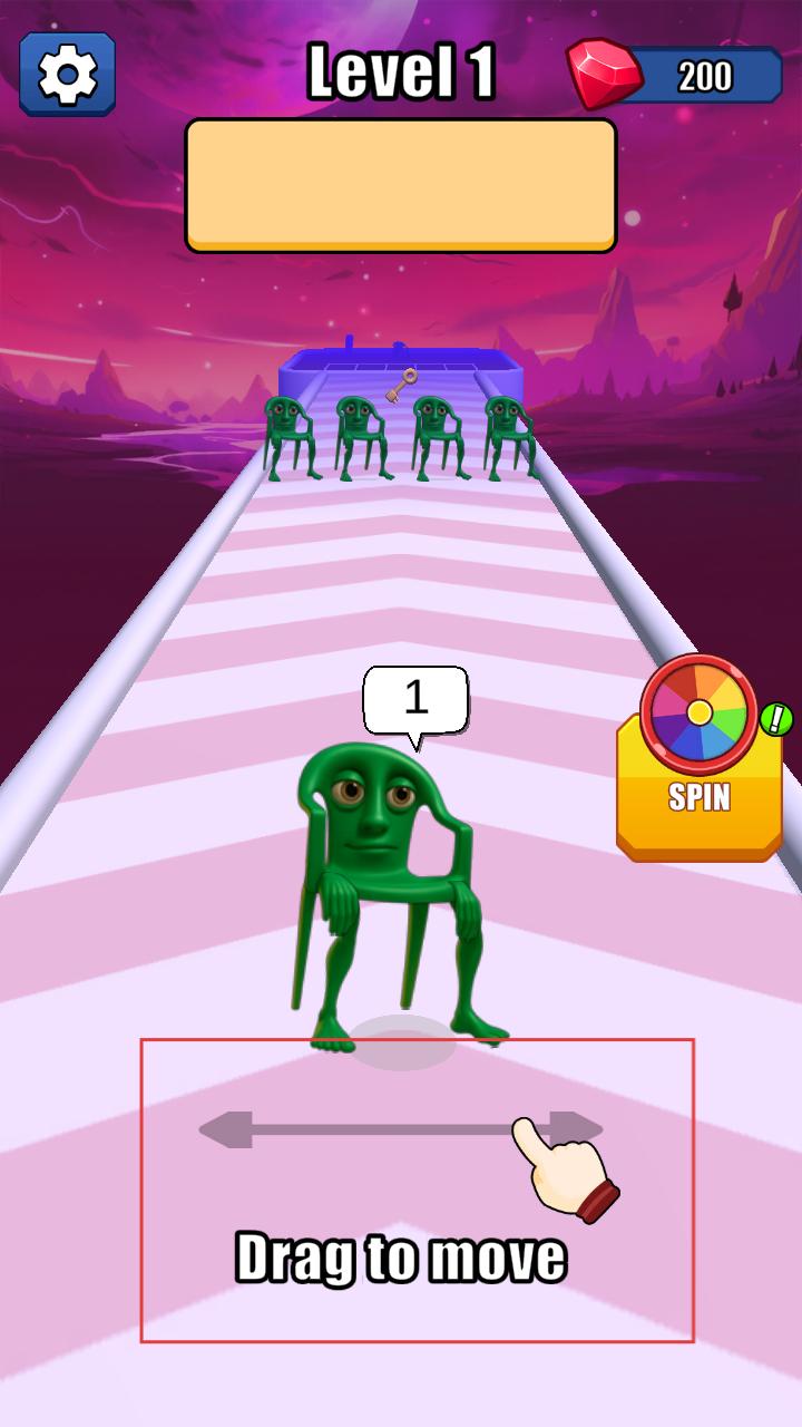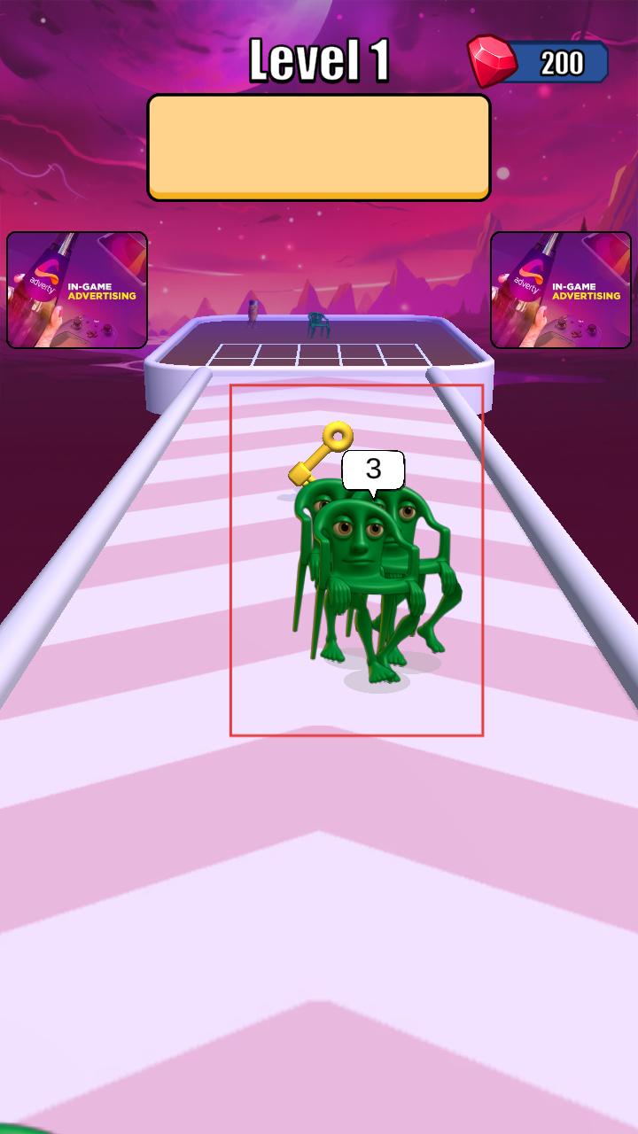 2、在賽道上遇到相同的綠色單位,通過移動(dòng)使其靠近,進(jìn)行合并,逐步增強(qiáng)角色實(shí)力。