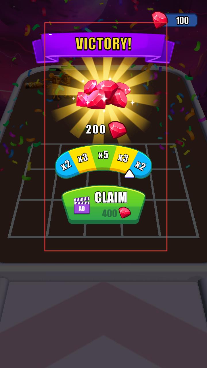 4、到達(dá)終點(diǎn)后會(huì)出現(xiàn)VICTORY勝利界面,獲得紅寶石獎(jiǎng)勵(lì),可繼續(xù)挑戰(zhàn)更高關(guān)卡,體驗(yàn)更多合并戰(zhàn)斗樂趣。