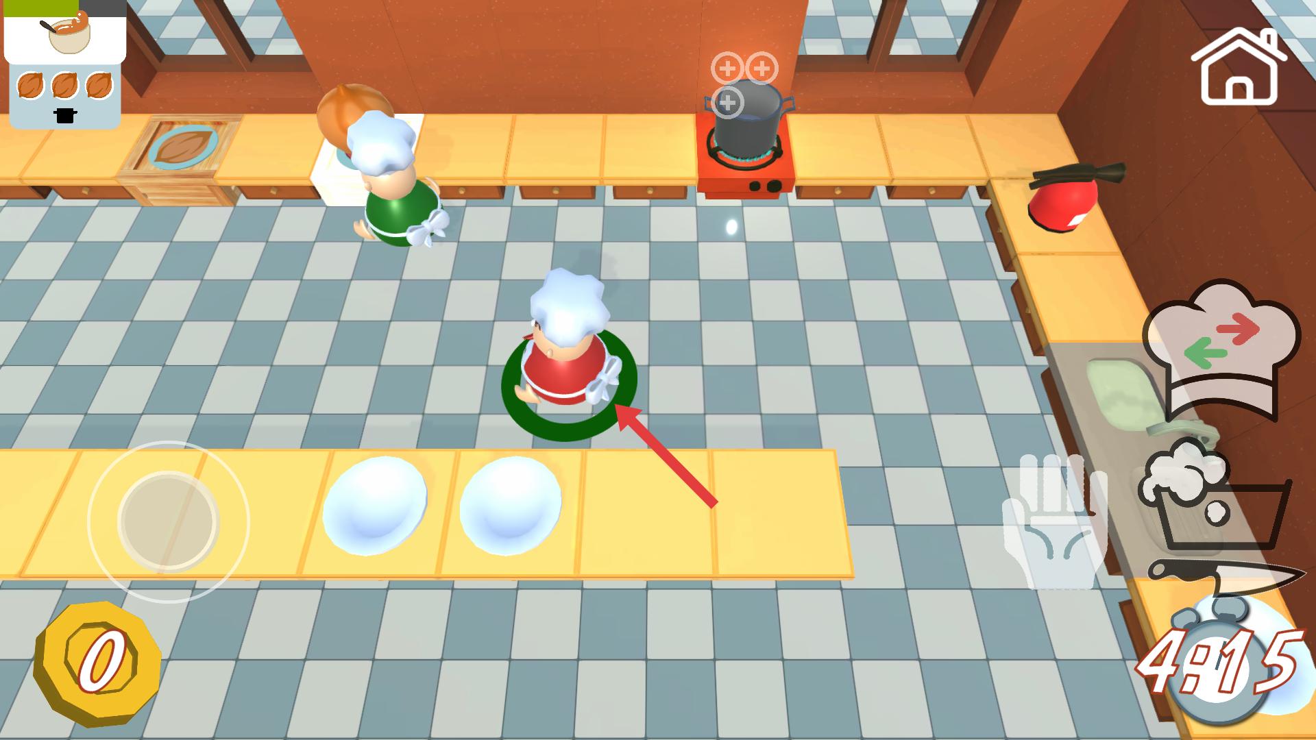 2、在廚房游戲界面,操控廚師移動(dòng),利用右側(cè)廚師帽樣式的移動(dòng)按鈕調(diào)整位置,靠近食材區(qū)域,以便進(jìn)行食材處理,同時(shí)注意時(shí)間限制,高效開展烹飪準(zhǔn)備。