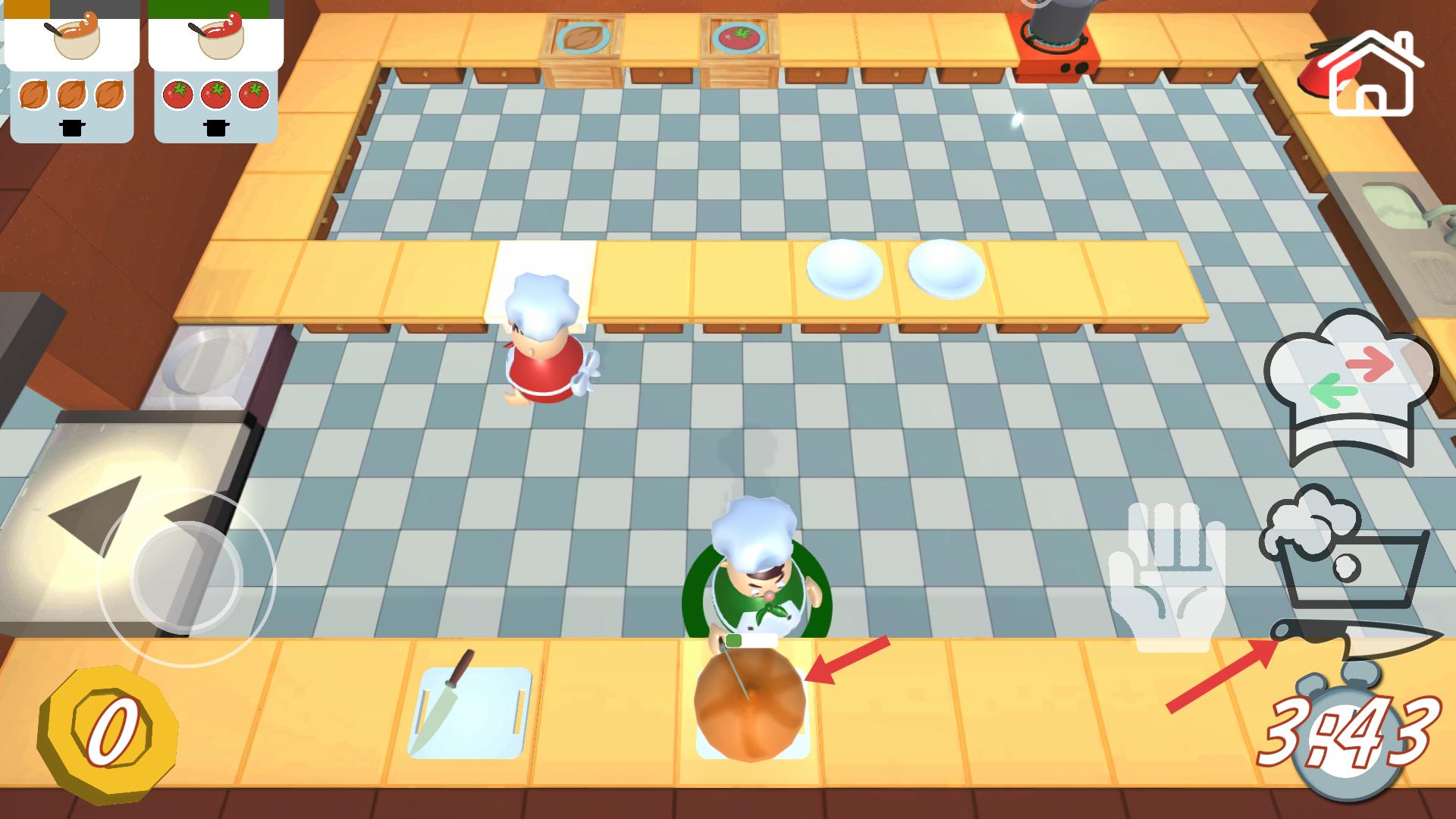 4、操控廚師靠近食材,點(diǎn)擊刀具圖標(biāo)處理食材,如處理南瓜等,合理利用廚具,在時(shí)間內(nèi)完成食材處理,推進(jìn)菜品制作。