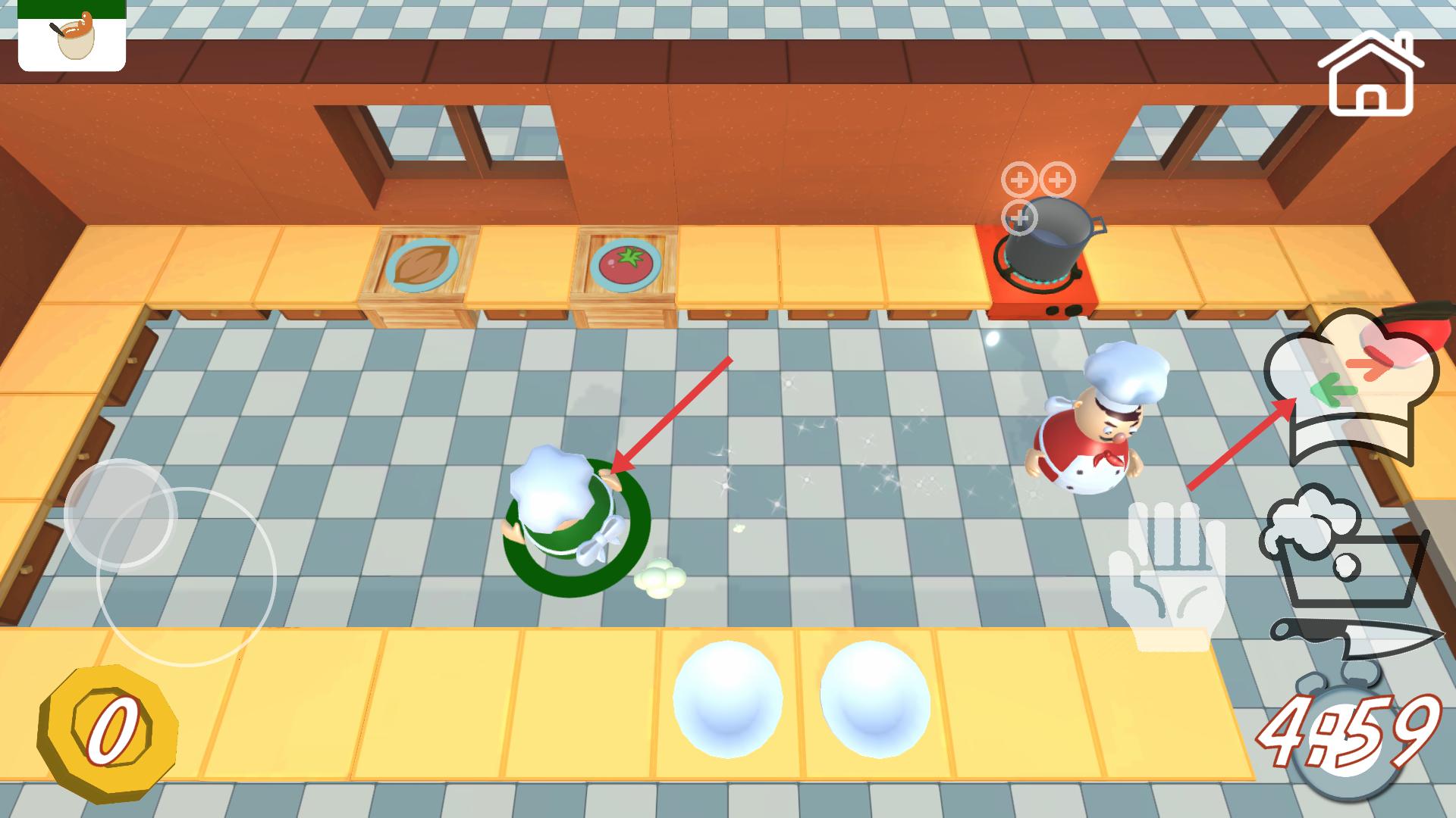 3、烹飪過(guò)程中,可切換不同廚師角色,利用其位置和功能協(xié)同作業(yè),與其他廚師配合,在時(shí)間限制內(nèi)完成菜品制作,提升烹飪效率。