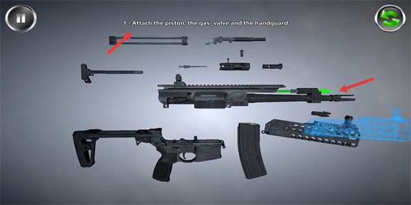 3、根據(jù)提示安裝活塞、氣閥和護(hù)手等部件,嚴(yán)格按照順序和位置進(jìn)行,逐步推進(jìn)槍械組裝進(jìn)程。
