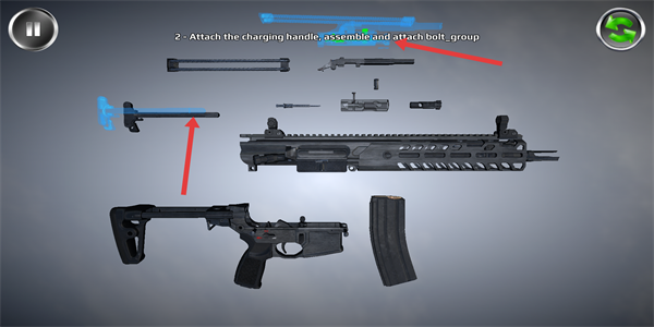 4、接著安裝拉機(jī)柄,組裝并安裝槍機(jī)組等部件,完成槍械的全部組裝步驟,感受槍械組裝的完整流程。