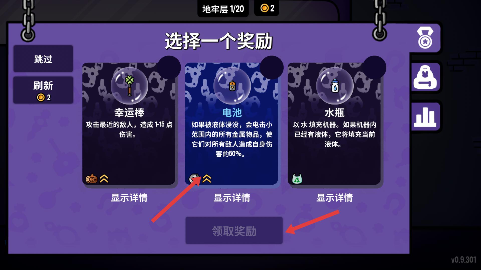 4、完成戰(zhàn)斗后,進(jìn)入獎(jiǎng)勵(lì)選擇界面,選擇后點(diǎn)擊領(lǐng)取獎(jiǎng)勵(lì),這些道具各有功效,如電池可電擊金屬物品傷害敵人,助力地牢冒險(xiǎn)。