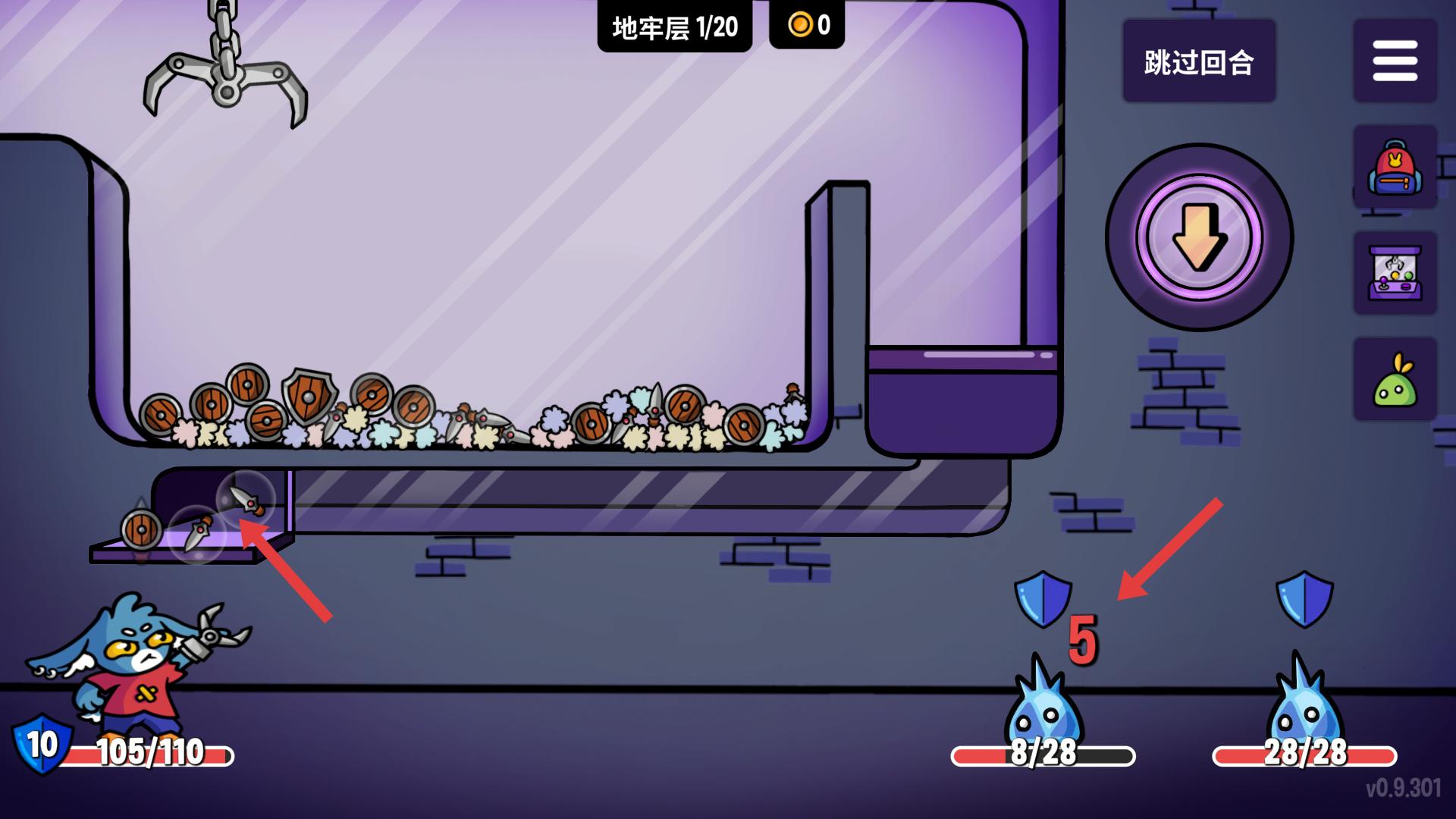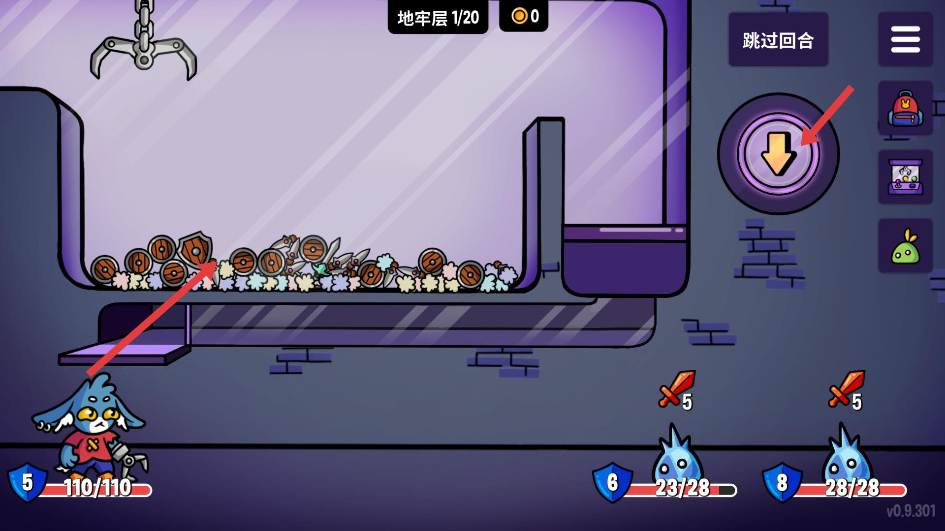 2、在地牢層游戲界面,點(diǎn)擊右側(cè)向下箭頭按鈕,可操控上方爪子抓取道具,如盾牌、武器等。