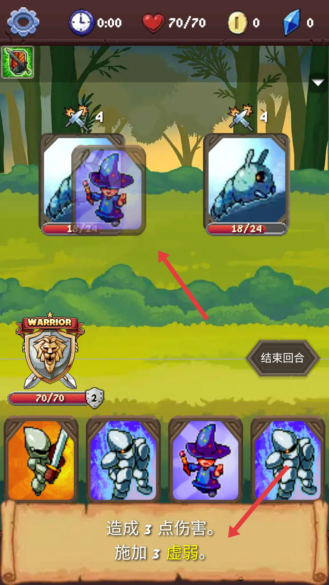 3、在戰(zhàn)斗中根據(jù)卡牌效果選擇合適的卡牌打出,攻擊敵人或施加狀態(tài),同時注意自身防御和狀態(tài)變化。