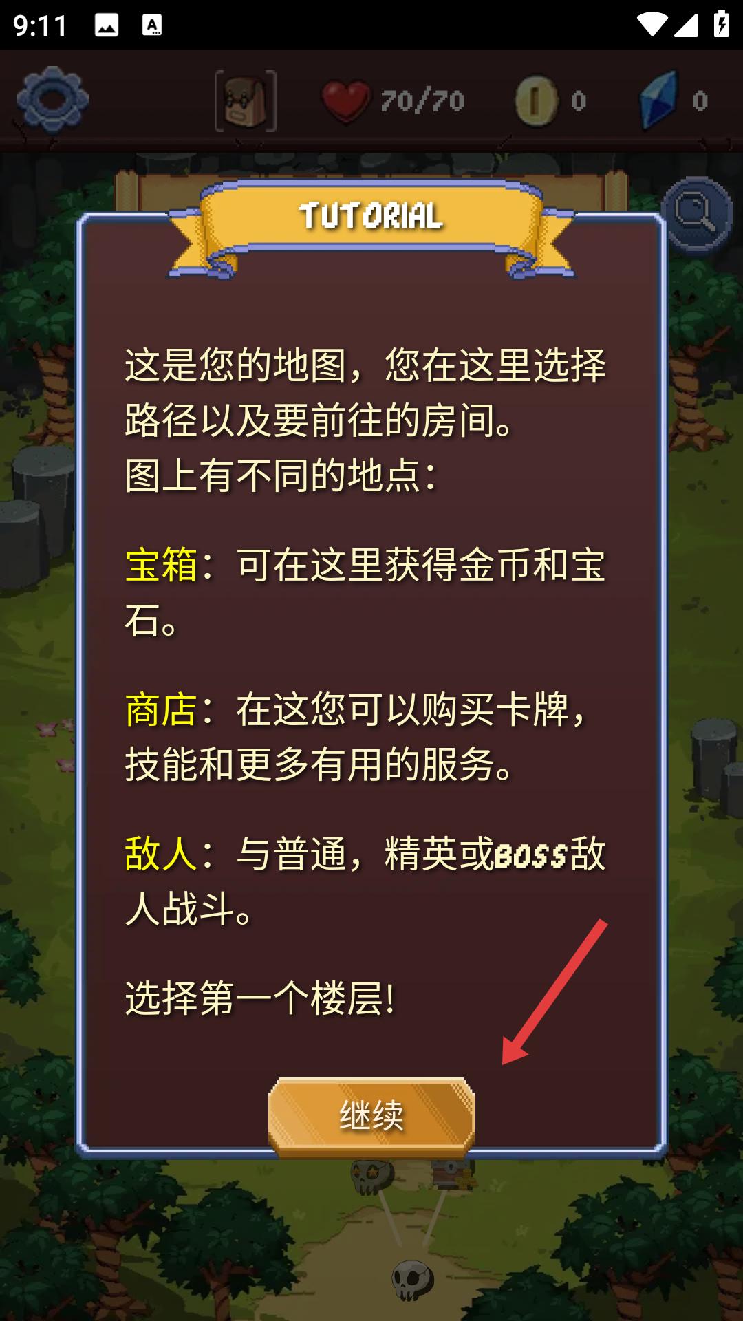 2、閱讀教程了解地圖功能,清楚寶箱、商店、敵人等不同地點的作用,點擊繼續(xù),開啟冒險之旅。