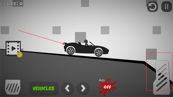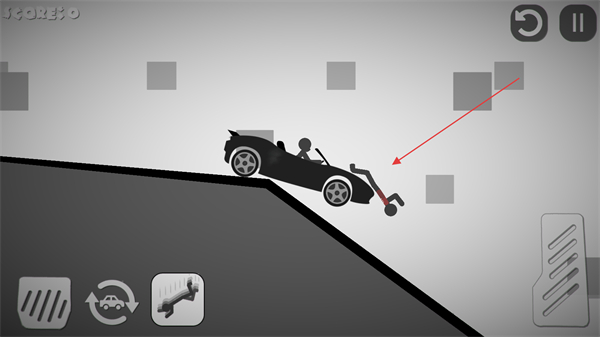 2、選擇車輛在地形中行駛,利用油門控制車輛速度,在崎嶇地形中行駛時(shí)造成車輛損壞和火柴人受傷,通過破壞獲取分?jǐn)?shù)。
