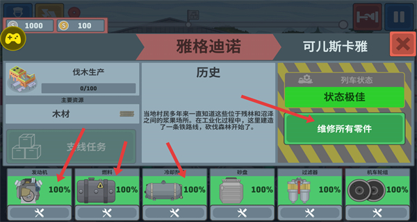 4、在進(jìn)入車站界面需要維修所有零件來維護(hù)列車,查看發(fā)動(dòng)機(jī)燃料箱等部件狀態(tài)保障列車性能。