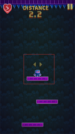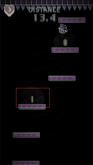 2、玩家操控角色在不斷出現(xiàn)的紫色平臺上跳躍,躲避上方的尖刺和掉落的危險,持續(xù)向下探索,挑戰(zhàn)更遠的距離。