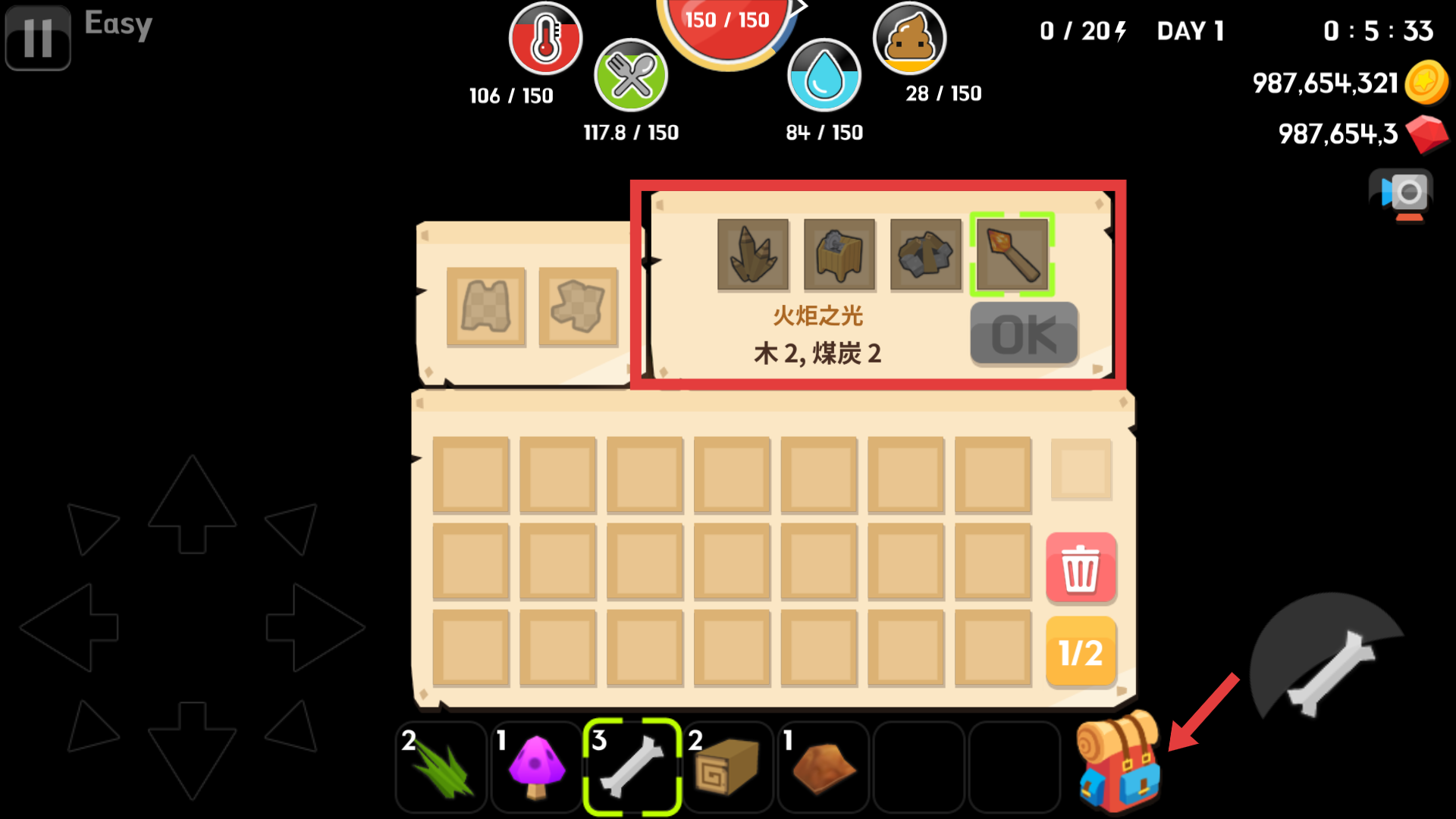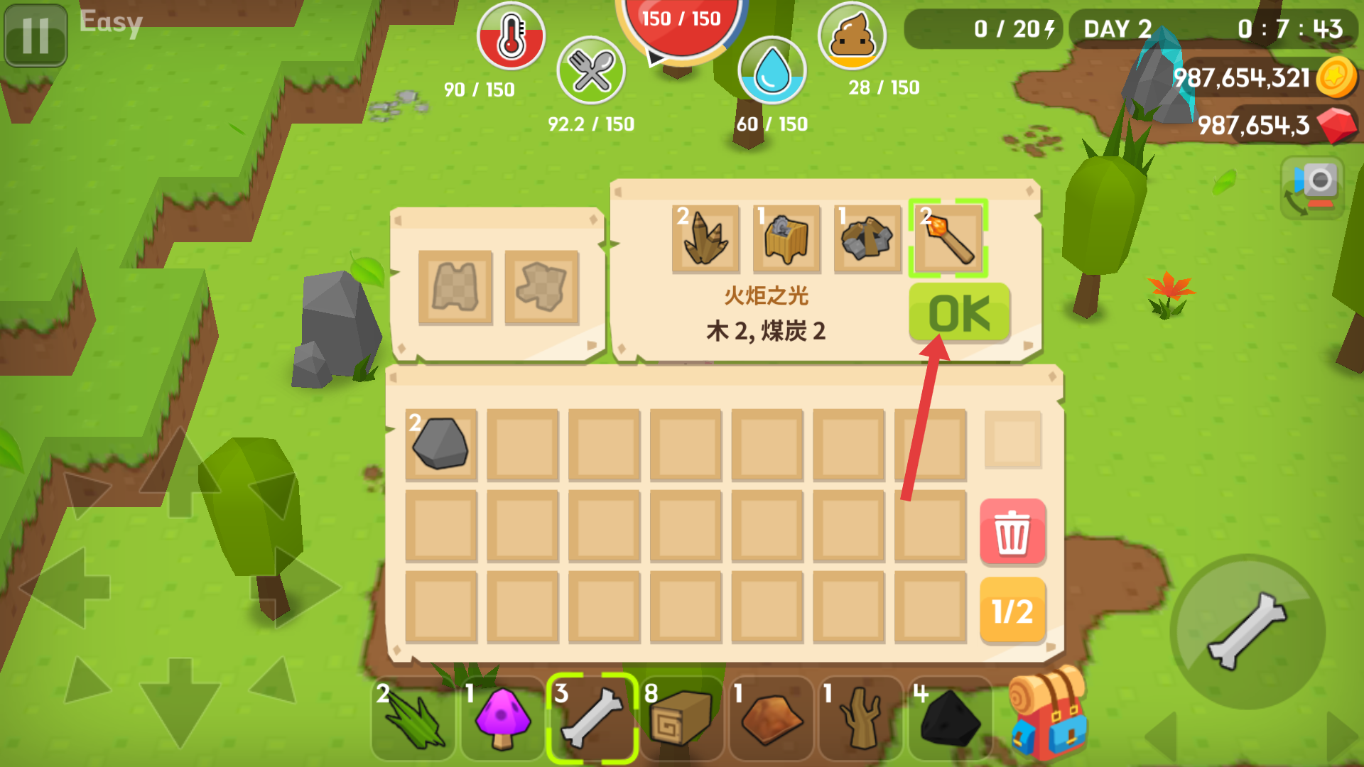 4、當(dāng)所擁有的材料滿足制作要求時(shí)如制造一個(gè)火炬,就在制作界面點(diǎn)擊綠色OK按鈕,即可完成制作獲得火炬,為游戲探索提供照明支持。