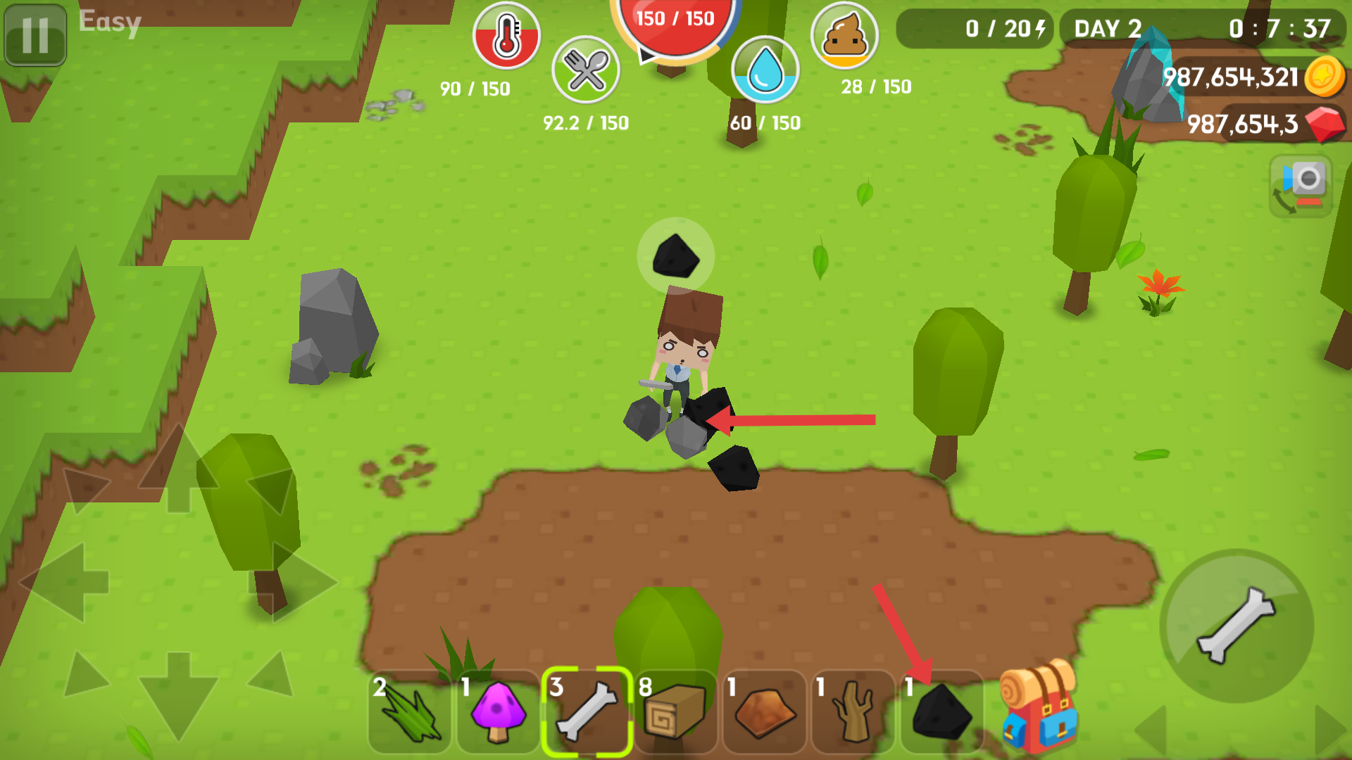 3、成功開(kāi)采資源后會(huì)掉落資源如煤炭,這些材料會(huì)自動(dòng)存入背包,玩家要為制作想要的東西積累足夠材料,然后持續(xù)使用工具再四處探索收集。