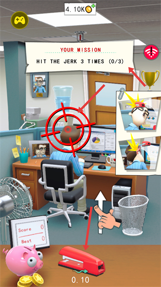 1、游戲開始時明確任務(wù)是擊中目標3次瞄準目標后點擊下方紅色訂書機,即可發(fā)起攻擊這是完成任務(wù)的基礎(chǔ)操作需準確點擊發(fā)起攻擊。