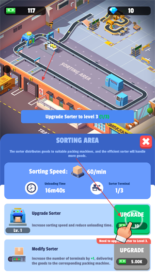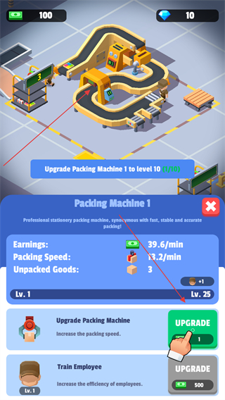 3、在快遞倉庫中可升級打包機(jī),提升其打包速度和收益,從基礎(chǔ)的打包效率逐步升級到更高等級,讓快遞處理流程更高效。
