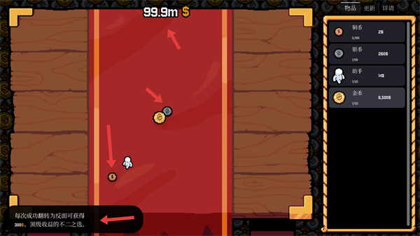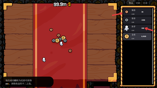1、游戲中每次成功翻轉(zhuǎn)銅幣為反面可獲得金幣要利用這一規(guī)則,持續(xù)翻轉(zhuǎn)銅幣來積累金錢同時關(guān)注右側(cè)物品欄中銅幣、銀幣、助手、金幣的解鎖進度為后續(xù)發(fā)展做準備。