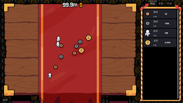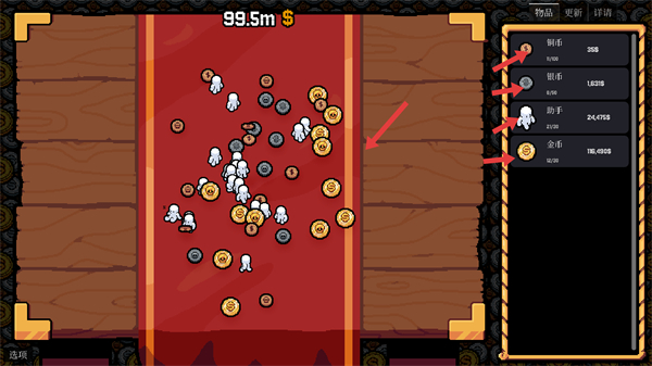 2、不斷解鎖右側(cè)物品欄中的助手助手可幫助自動收集貨幣,提升貨幣收集效率同時繼續(xù)翻轉(zhuǎn)銅幣,增加銀幣、金幣的數(shù)量加快財富積累速度。