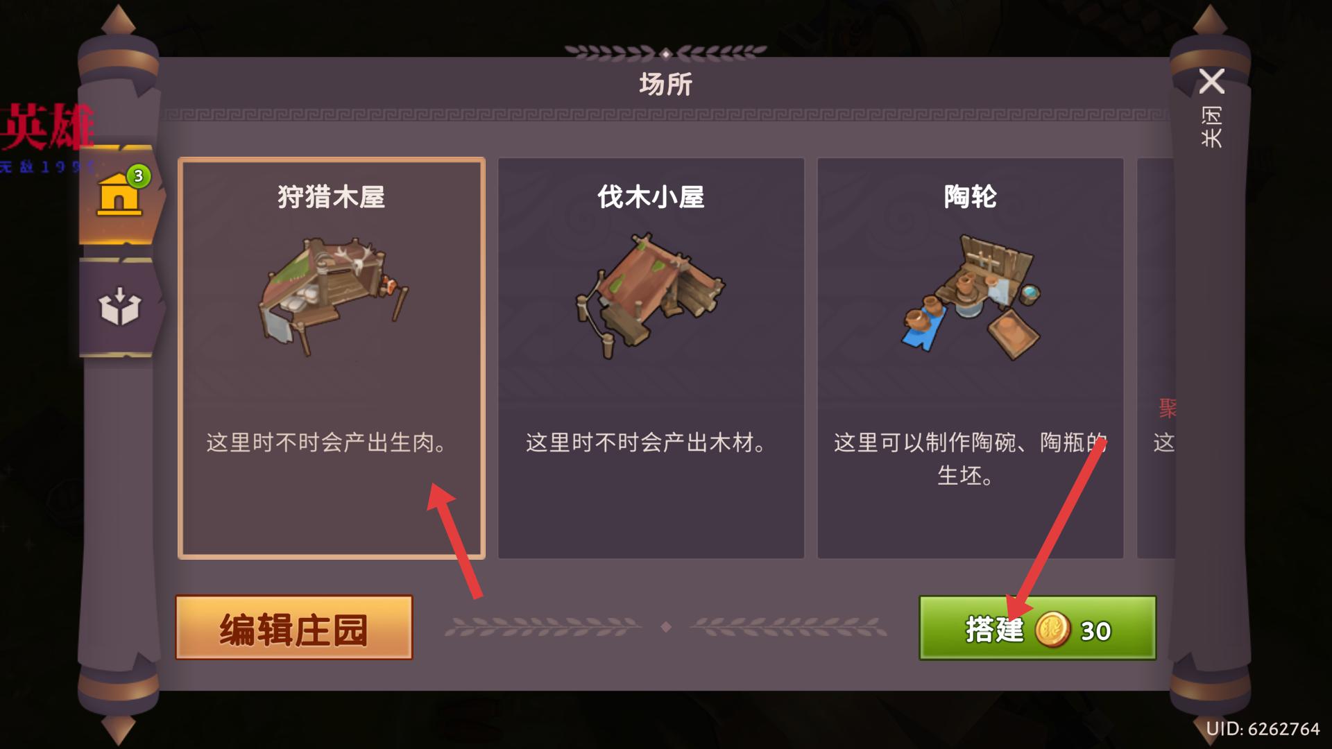 3、在場(chǎng)所選擇界面,根據(jù)需求選擇建筑,如狩獵木屋可產(chǎn)出生肉,花費(fèi)30金幣點(diǎn)擊搭建按鈕,獲取相應(yīng)建筑以提升莊園資源產(chǎn)出能力。