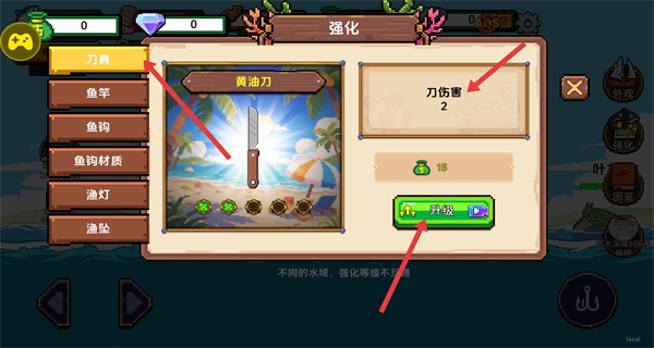 1、玩家點擊強化按鈕進入物品強化界面,先升刀具通過消耗金幣點升級提升刀傷害,刮魚鱗更輕松助力資源獲取。